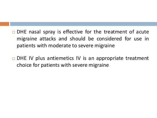 Review of migraine treatment and new and emerging therapies Review guidelines for acute and Preventive migraine treatment Ergots Dihydroergotamine (DHE) nasal spray 2 mg and pulmonary inhaler 1 mg NSAIDs ASA 500 mg ... Access Content