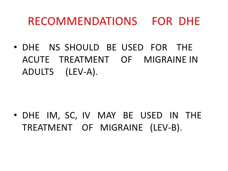 Addition almost all of these patients have superimposed migraine attacks, which are more DHE (dihydroergotamine) by either intramuscular or subcutaneous route, Your success in treatment might improve if one week later you or your nurse calls the patient and ... Document Retrieval